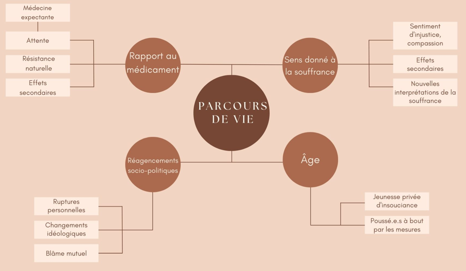 En conclusion, le premier chapitre de notre enquête nous a montré que les argumentaires présents dans le discours de nos participant·e·s sont en continuité avec des arguments transhistoriques, à savoir politiques, émotionnels-moraux, et épistémiques, qui reviennent dans le discours d’opposant-e-s lors de découverte de vaccins. Ce second chapitre ajoute qu’il est pertinent d’analyser la pandémie sous l’angle du parcours de vie. Les discours effectuent un va-et-vient entre l’incarnation d’un parcours de vie au sens individuel et institutionnel (Kohli, 1986) en ce qu’il invoque autant des souffrances et sentiments privés que des changements structurels dans un ordre établi.
