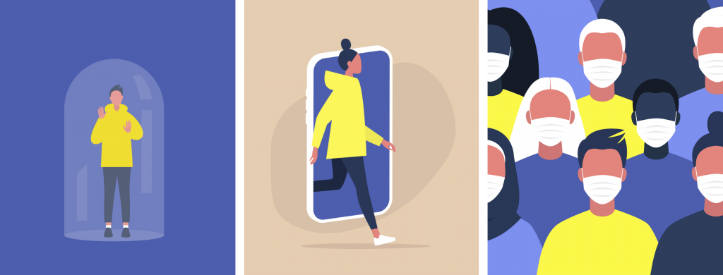 - Conventions sociales : Garder ses distances dans les lieux publics et/ou porter un masque modifient les conventions sociales. Comment signifier à un individu que l’on souhaite entrer en interaction avec lui ? Comment ne pas vexer un individu lorsque l’on change de trottoir à son approche ?