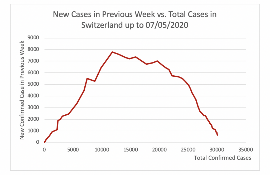 Figure 1 displays the evolution of total confirmed cases (horizontal axis) and new confirmed cases in the previous week (vertical axis) in Switzerland since the 100th confirmed case. It shows that the apex of the epidemic in Switzerland was reached at 7782 cases per week. This took place on March 26. Since then the number of new cases per week has steadily decreased to 817 on May 5.