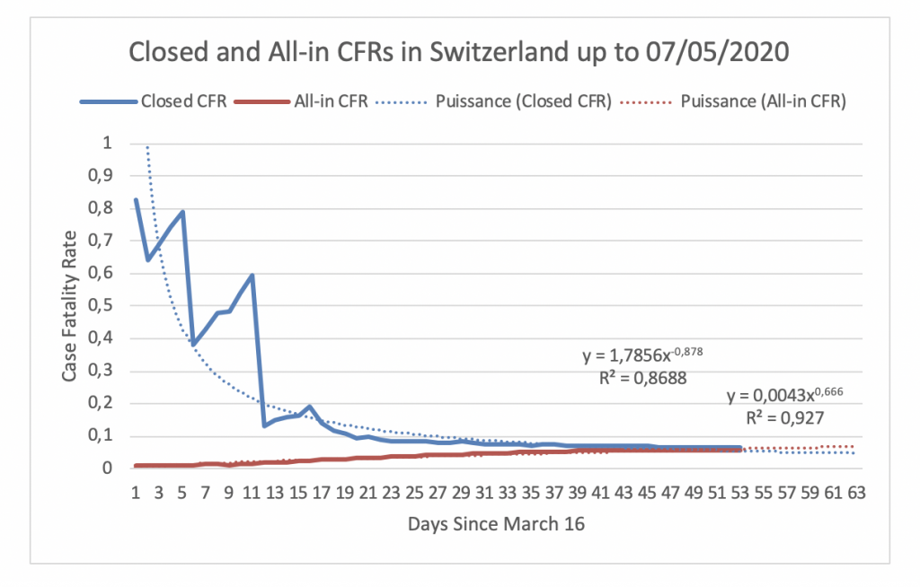 We see from Figure 2 that the Closed CFR and the All-in CFR in Switzerland are very close to each other. In fact, their values are 6.34% and 5.83%, respectively. The blue dotted curve depicts a power trend that fits the evolution of the Closed CFR and the red dotted line depicts a power trend that fits the evolution of the All-in CFR. When the two trends intercept the closed CFR and the all-in CFR are identical. This happens when the CFR is 5.8%.