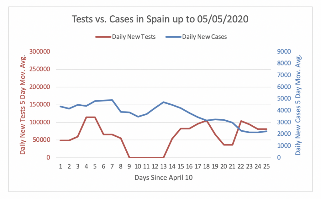 Figure 15 shows that Spain was not performing enough tests to detect cases until the 28th of April. However, in the last few days the daily new tests are adequate to detect cases. The number of daily new tests performed in Spain has been at around 50000 tests per day during the last 24 days. Since the number of daily new cases has been steadily decreasing in the past 24 days, the number of daily new tests is now about 36 times the number of daily new cases.