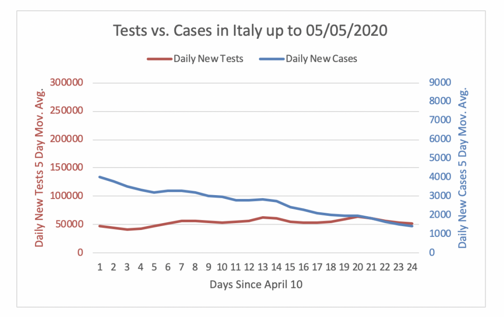 Figure 9 shows that Italy was not performing enough tests to detect cases until the 30th of April. However, in the last few days the daily new tests are adequate to detect cases. The number of daily new tests performed in Italy has been at around 50000 tests per day during the last 24 days. Since the number of daily new cases has been steadily decreasing in the past 24 days, the number of daily new tests is now 37 times the number of daily new cases. Hence, Italy is doing enough testing.