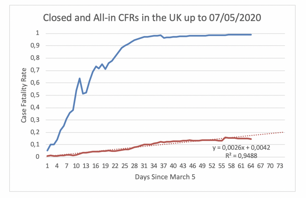 Figure 8 displays the evolution of the Closed CFR and the All-in CFR in Italy since February 24, the day the Closed CFR in Italy attained its maximum. Figure 8 shows that the Closed CFR and All-in CFR have not yet converged. On May 7, the Closed CFR is 24% and the All-in CFR is 14%. Hence, the gap between the CFRs in Italy is 10%. If the CFRs follow their respective fitted trends, they will intercept at 19.31% on June 11.