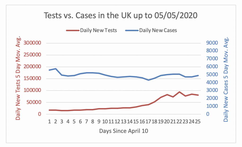 Figure 21 shows that the UK is not performing enough tests to detect cases. On May 5, the number of daily new tests is only about 16.5 times the number of daily new cases. With about 4891 cases on May 5 the UK would need to perform 163300 tests to reach a 3% share of positive tests. However, the UK only performed 80927 tests on May 5. Hence, the gap in testing is 82373 = 163300 – 80927.