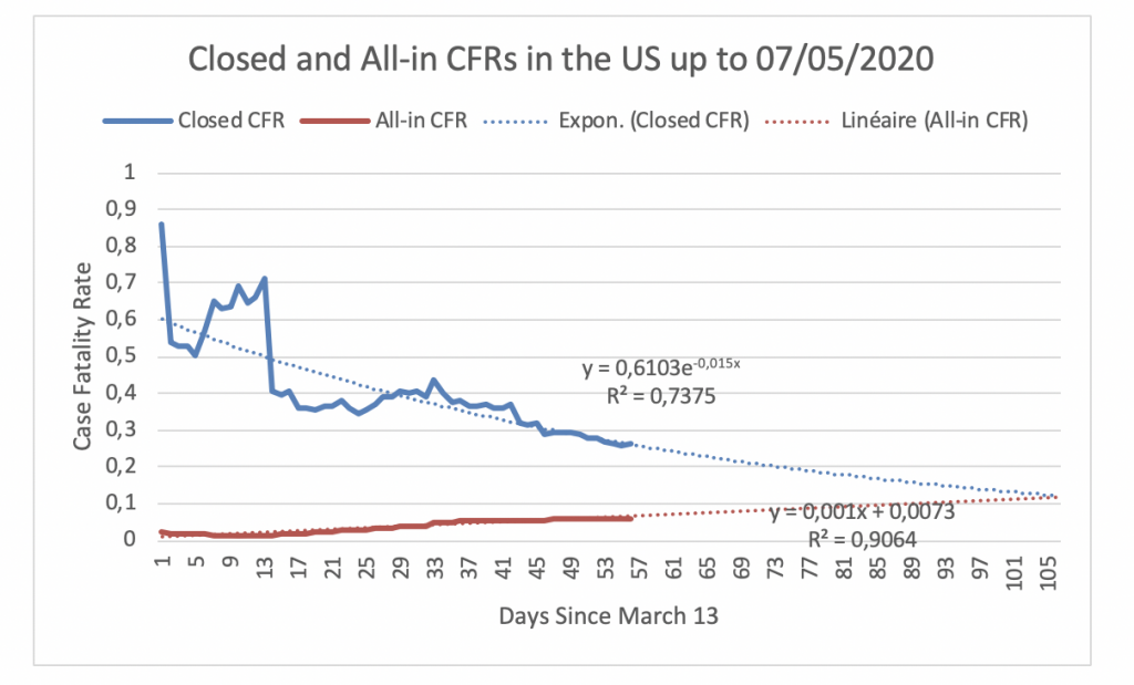 Figure 11 displays the evolution of the Closed CFR and the All-in CFR in France since March 16, the day the Closed CFR in France attained its maximum. Figure 11 shows that the Closed CFR and All-in CFR have not yet converged. On May 7, the Closed CFR is 32% and the All-in CFR is 14%. If the two CFRs follow their respectively fitted trends, they will meet at 30.36% on June 29.